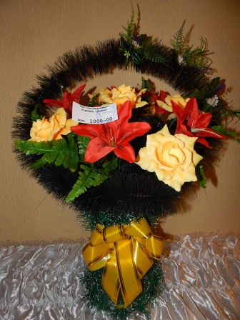 1. Красные лилии, желтые крупные розы и веточки зелени. (в настоящее время нет в наличии)